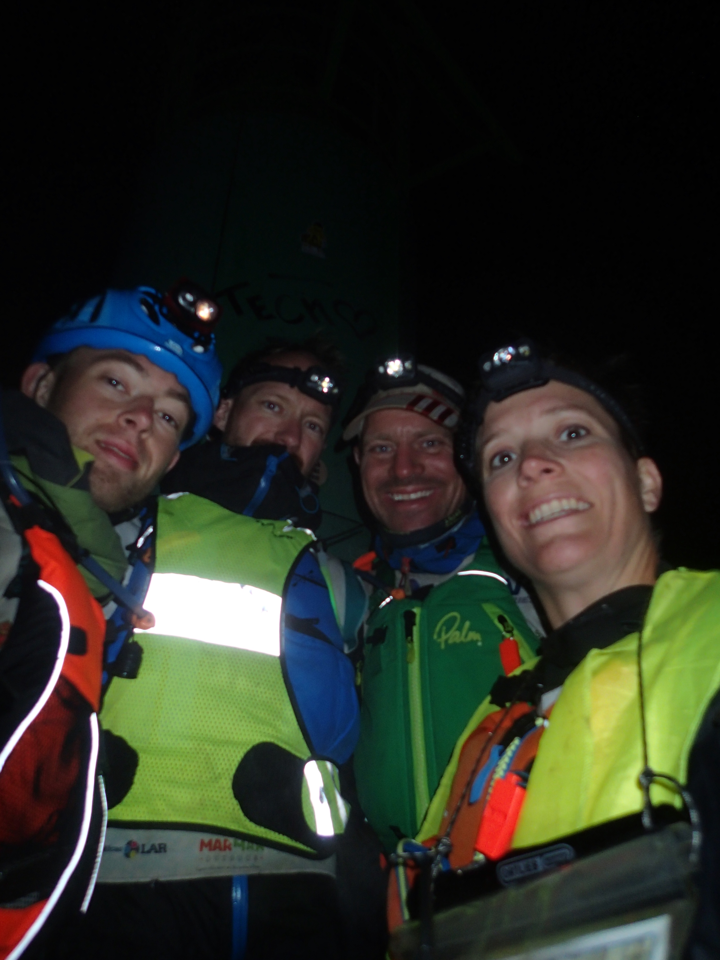 Inmiddels waren we 2,5 uur sneller dan onze planning en dat was maar goed ook, want de volgende etappe was een van de mammoet etappes van de race. 133km mountainbiken met een duizelingwekkende 5200 hoogtemeters, en de strakke cut-off aan het einde. Vol goede hoop, en zonder een echt idee hoeveel hoogtemeters 5200 hoogtemeters nou echt zouden zijn fietsten we weg. De checkpoints kwamen aanvankelijk makkelijk en snel, en we konden ons na CP11 en CP12 zelfs twee microslaapjes van 10 minuten permitteren. Uit ons schoonheidsslaapje na CP12 werden we echter bruut gewekt door de koplampen van teams 106 en 107. In onze slaapdronken gemoedstoestand leken dit de koplampen van een auto en aangezien we met onze fietsen midden op de weg lagen doken we nu luid schreeuwend met onze fietsen de berm in. De teams 106 & 107 keken verbaast op toen ze langs ons fietsten en vroegen nog of het goed ging met ons. Nadat we bijgekomen en uitgelachen waren over onze vluchtactie stapten we weer op de fiets. We zijn nog nooit zo snel en effectief wakker geworden tijdens een adventure race! Ook toen na deze breaks de zon opkwam gingen we aanvankelijk lekker door.