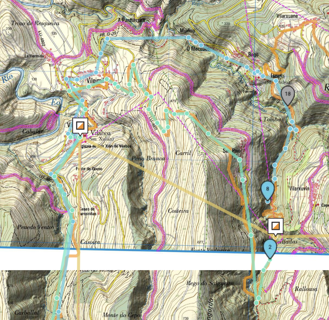 De eerste trekking etappe was er een met een heel aantal kilometers buiten de paden. Er waren veel mogelijke goede routes, en dat bleek ook uit de tracking waar alle teams voortdurend verschillende keuzes maakten. We liepen hier een heel stuk gelijk op met een 2-persoons team uit Estland. Zij maakten elke keer een andere routekeuze als wij, maar op de plekken waar onze paden elkaar kruisten kwamen we elkaar keer op keer weer tegen. Dat zorgde voor wat rivaliteit en erg leuke momenten als we elkaar voor de zoveelste keer weer tegen kwamen. Binnen 10 uur hadden we deze etappe achter de rug en toen de klokken van de kathedraal van Mondonedo middernacht sloegen waren we met de beentjes omhoog aan het genieten van een warme adventure food maaltijd.